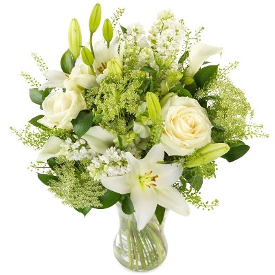 Een rustgevende melange van pure witte bloemen, waaronder rozen en lelies, tegen een achtergrond van groen blad uit het seizoen. Hiermee breng je je emoties op elegante wijze over. Een mooi gebaar met een klein prijskaartje.